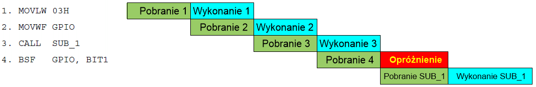 Opis: Wykonanie bezwarunkowego skoku w programie. 11-bitowy adres bezpośredni jest ładowany do dolnych jedenastu bitów licznika programu PC[10:0]. Górne bity PC zostają załadowane z zatrzasków PCLATH[4:3]. Instrukcja GOTO jest wykonywana w dwóch cyklach rozkazowych. Jest to konieczne, aby przeładować kolejkę instrukcji.