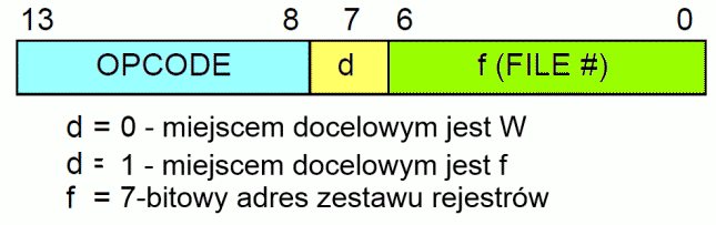 | d | Bit określający rejestr docelowy operacji: d = 0: rejestrem docelowym jest W d = 1: rejestrem docelowym jest f |