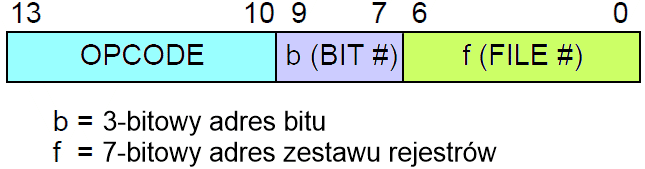| BSF f,b | Ustawianie bitu b w f | 1 | 01 01bb bfff ffff |