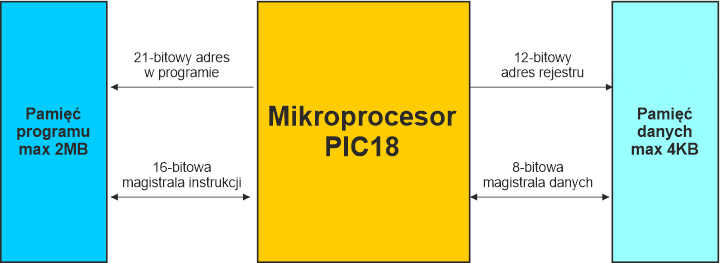 Z powyższego rysunku wynika, iż magistrala adresowa pamięci programu ma szerokość 21 bitów, co pozwala zaadresować 221 bajtów, czyli 2MB. Ponieważ prawie wszystkie instrukcje mikrokontrolera PIC18 mają długość 16 bitów, to w celu zapewnienia ich pobrania w jednym takcie zegarowym magistrala instrukcji ma szerokość 16 bitów.