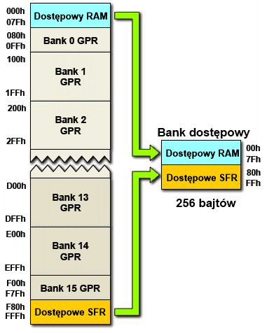 Bank dostępowy (ang. Access Bank) jest zawsze dostępny dla procesora i zawiera 128 rejestrów GPR z samego początku pamięci oraz 128 rejestrów SFR z końca pamięci danych.