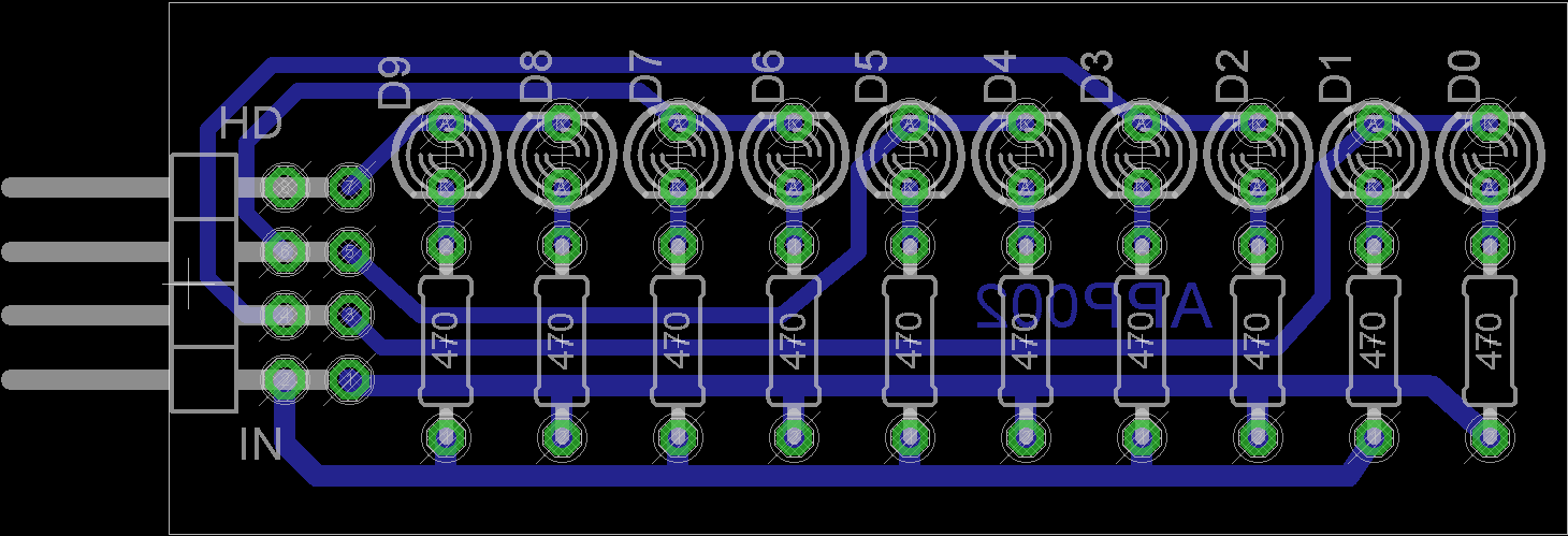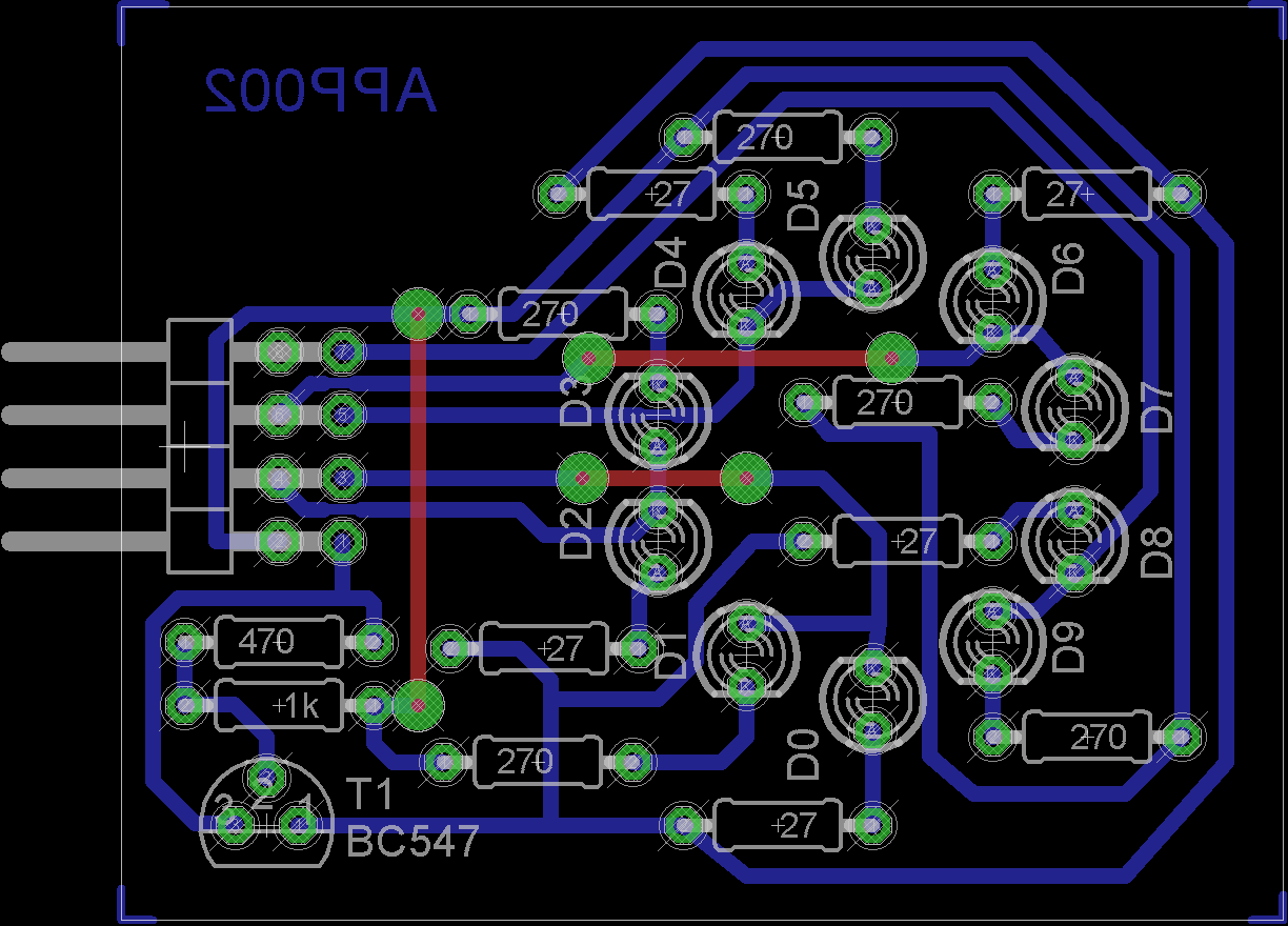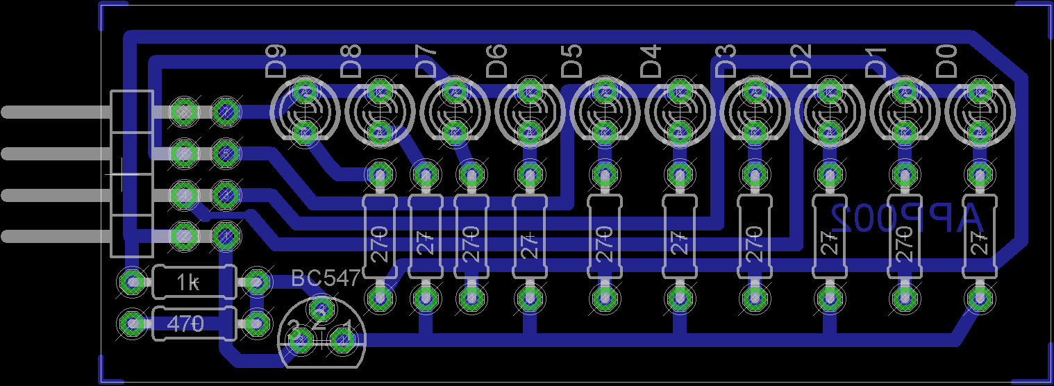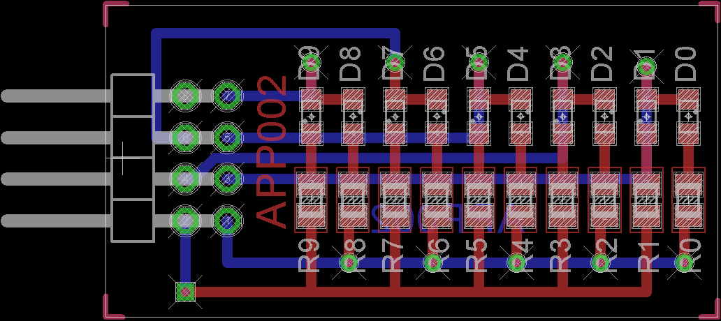 Płytka APP002 przewlekana z niebieskimi diodami LEDZaprojektujemy płytkę, która będzie zawierała 10 niebieskich diod LED. Schemat układu jest następujący:
