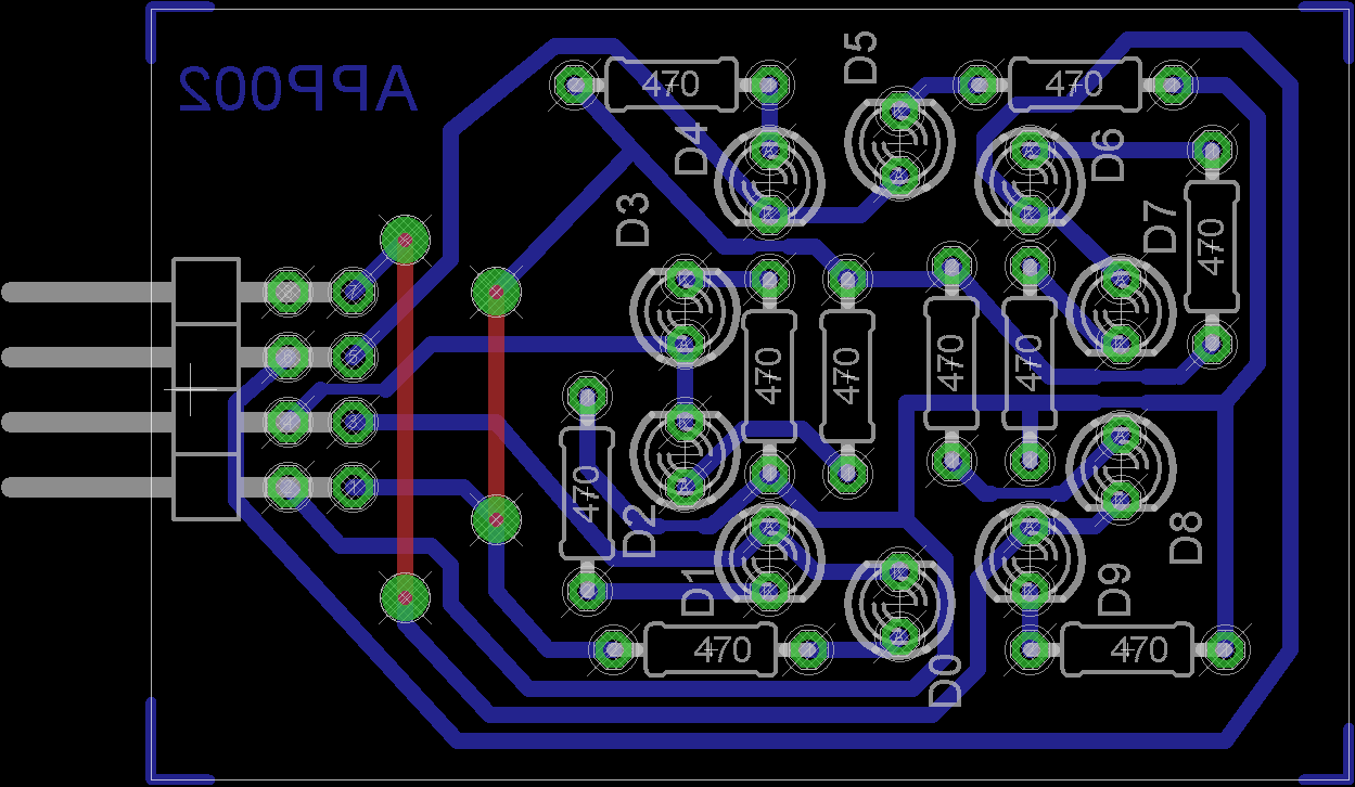 Płytka aplikacyjna APP002 z diodami czerwonymi ustawionymi w kołoPoniżej projekt płytki APP002 wykorzystujący diody czerwone LED 3mm.