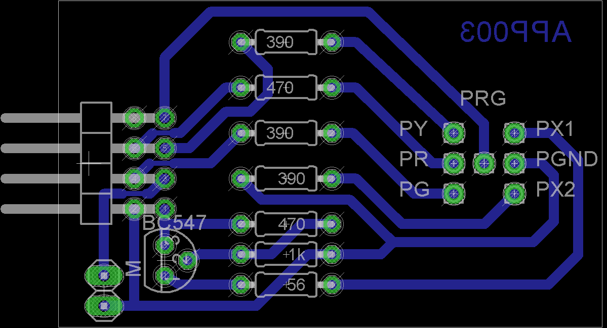 Poniżej opisujemy kolejne etapy tej pracy. Po wykonaniu płytek PCB wlutuj w nie elementy elektroniczne. Do płytki sygnalizatora wlutuj 7 cienkich przewodów od strony ścieżek (aby nie zasłaniały diod LED). Przewody powinny być różnokolorowe, aby później ich nie pomylić przy wlutowywaniu do płytki APP003. Możesz tutaj użyć przewodów z kabla sieciowego UTP.