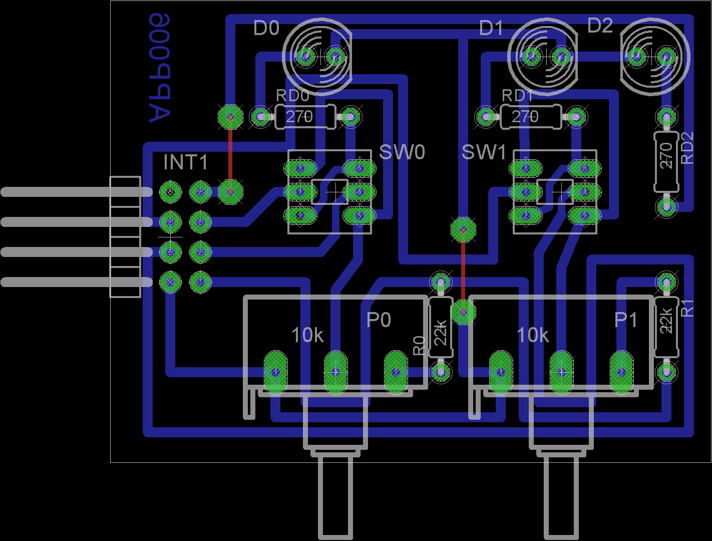 6_PIN_DPDT_7X7 (przełączniki x 2) GND (masa x 6) R_POT_ROTARY (potencjometry x 2) R-EU 0204/7 (oporniki x 5) LRD5MM (diody LED x 3)