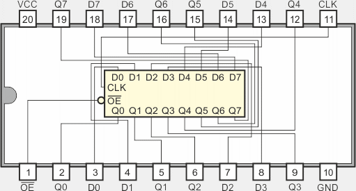 Buforowane wejście sterowania wyjściami OE (ang. Output Enable) może być wykorzystane do umieszczeniu na wyjściach układu normalnych stanów logicznych (niskich lub wysokich) lub stanu wysokiej impedancji, w którym wyjścia nie pobierają, ani nie oddają prądu na linie magistrali.