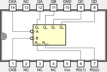 Układ 7492 zawiera 4-bitowy licznik dwunastkowy (ang. Divide-by-twelve Binary Counter). Licznik wewnętrznie składa się z dwóch modułów liczących odpowiednio do 2 i do 6. Wejście zegarowe A dotyczy modułu liczącego do 2, wejście zegarowe B dotyczy modułu liczącego do 6. Wynik z modułu 2 pojawia się na wyjściu QA, wynik z modułu 6 pojawia się na pozostałych wyjściach QB, QC i QD. Zliczanie odbywa się przy opadającym zboczu sygnału zegarowego. Dodatkowo licznik posiada dwa wejścia zerujące R0(1) i R0(2) (stan wysoki na obu tych wejściach powoduje wyzerowanie licznika). Licznik z modułem 6 składa się z zespołu liczącego z modułem 3, do którego podłączone jest wejście B. Wynik zliczania pojawia się na wyjściach QB i QC. Następnie wyjście QC jest wewnętrznie połączone z przerzutnikiem zliczającym z modułem 2. Wynik pojawia się na wyjściu QD. W efekcie licznik z modułem 6 liczy w kodzie 321.