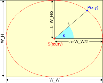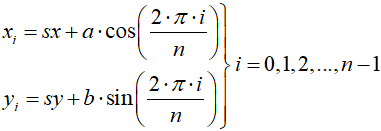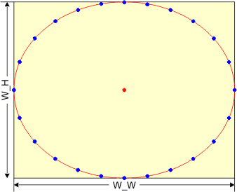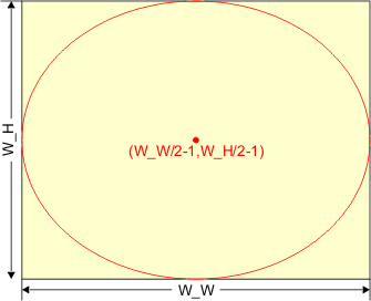 Na rysunku zaznaczone są również współrzędne punktów narożnych. W okno wpisujemy elipsę, tak aby stykała się z jego krawędziami: