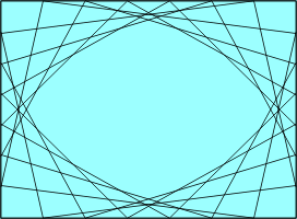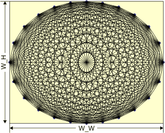 Kolejny program tworzy ciekawą grafikę, łącząc ze sobą punkty leżące na obwodzie elipsy wpisanej w ekran. Pokażę krok po kroku, jak należy podejść do tego od strony matematycznej.