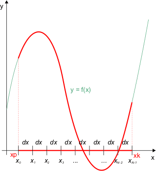 Przez dx oznaczamy tutaj odległość między dwoma sąsiednimi punktami. Jak policzyć wartość dx? Wystarczy zauważyć, że n punktów dzieli przedział na n-1 segmentów o długości dx: