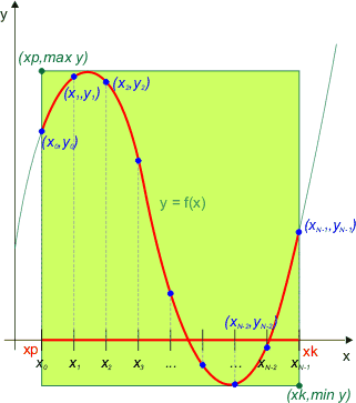 Lewy górny narożnik prostokąta ma współrzędne (xp, max y), gdzie przez max y rozumiemy największą wartość współrzędnej y punktów wykresy. Podobnie prawy dolny narożnik prostokąta ma współrzędne (xk,min y), gdzie min y oznacza najmniejszą wartość współrzędnych y punktów wykresu. Wartości max y i min y możemy obliczać w trakcie wyznaczania kolejnych yi.