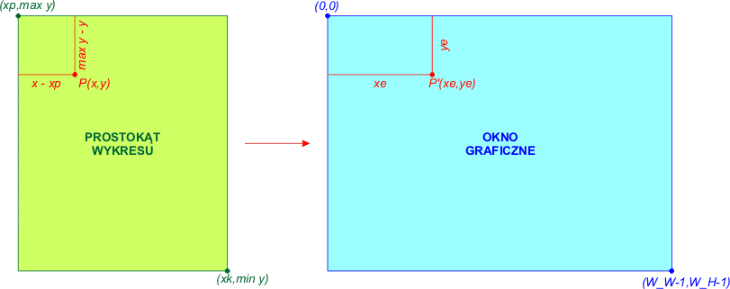 Co to znaczy odwzorować? Znaczy to: znaleźć wzór przeliczeniowy, który punkt P o współrzędnych (x,y) w obszarze prostokąta przetwarza w punkt P' o współrzędnych (xe,ye) w obszarze graficznym okna, przy czym narożniki prostokąta wykresu mają przechodzić w narożniki okna graficznego. Tworzymy proporcje: