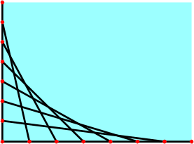 Wykorzystując pomysł z programu powyżej można uzyskać jeszcze ciekawszy efekt graficzny. W tym celu wyznaczamy równoodległe punkty na krawędziach poziomych i pionowych okna: