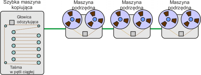 Gdy PĘTLA GŁÓWNA jest ciągle odczytywana, zapisane na niej dane (wszystkie cztery ścieżki naraz) są kopiowane na taśmy w MASZYNACH PODRZĘDNYCH.