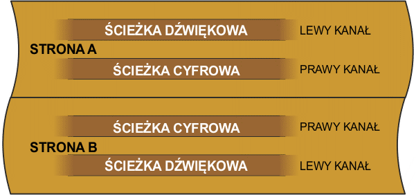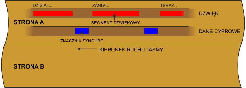 Na każdej taśmie są dwie strony. Każda strona posiada dwie ścieżki, jedną dźwiękową i drugą do nagrań cyfrowych. W ten sposób taśma może być nagrywana w obu kierunkach. Poniżej jest płaski widok fragmentu taśmy.