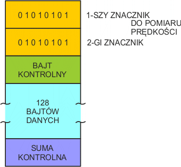 Rekordy mają długość 132 bajtów. Rekord rozkłada się następująco: 2 znaczniki do pomiaru prędkości, bajt kontrolny, 128 bajtów danych i bajt sumy kontrolnej. Format rekordu pokazany jest poniżej: