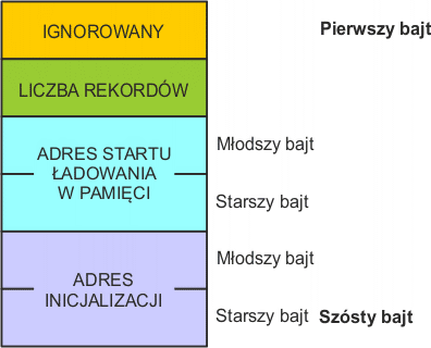 Bajty nr 3 i 4 zawierają adres (dolny/górny bajt), pod który rozpocznie się ładowanie pierwszego bajtu tego pliku.