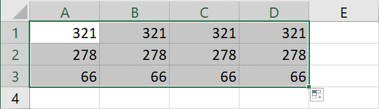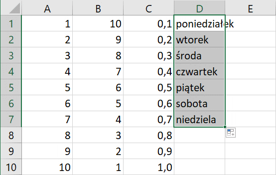Zwróć uwagę, iż teraz kursor obejmuje obszar komórek od A1 do A10. Ponownie przeciągnij uchwyt kopiowania na kolumny B, C i D i zwolnij lewy przycisk myszki: