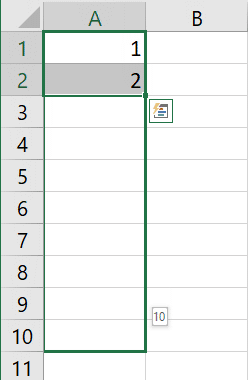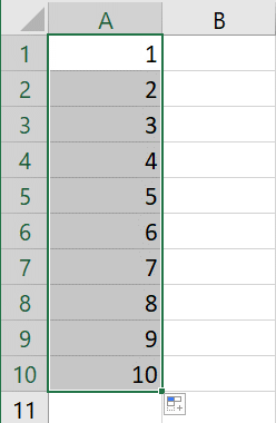 Teraz przeciągnij uchwyt kopiowania w dół, tak aby zaznaczenie objęło obszar komórek do A10: