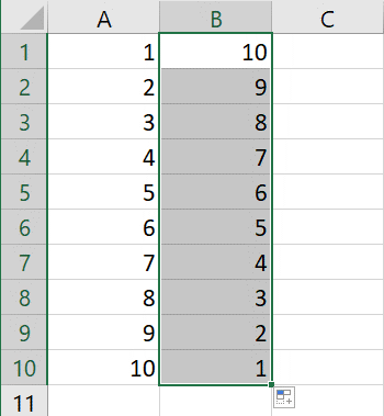 Wyrazy ciągu nie muszą rosnąć. W komórkach B1 i B2 wpisz 10 i 9, zaznacz te komórki i przeciągnij w dół uchwyt kopiowania do komórki B10: