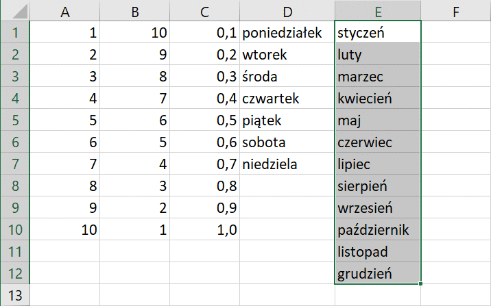 W komórce E1 wpisz styczeń, w E2 luty, zaznacz obie komórki i przeciągnij uchwyt kopiowania do komórki E12. Dopasuj szerokość kolumny E: