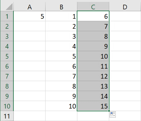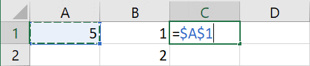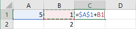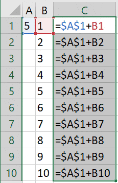 Komórka B1 była adresowana względnie, dlatego przy kopiowaniu jej adres został odpowiednio zmieniony. Komórka A1 została zaadresowana bezwzględnie – znak $ przy oznaczeniach kolumny i wiersza oznacza zablokowanie zmian kolumny i wiersza. Dlatego w kolejnych kopiach adres pozostał niezmienny.
