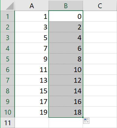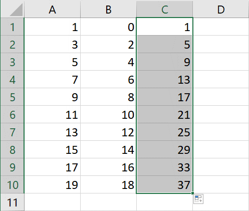 Wypełnijmy komórki kolumny od A1 do A10 kolejnymi liczbami nieparzystymi. Do A1 wpisz 1, do A2 wpisz 3, zaznacz A1 i A2, po czym skopiuj komórki do A10: