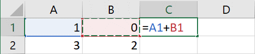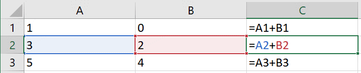Zwróć uwagę, że formuły w każdej komórce są nieco inne. Przy kopiowaniu formuł obowiązuje zasada zachowania położenia argumentów względem komórki z formułą. Popatrz na komórkę C1. Umieszczona w niej formuła zawiera adresy A1 i B1, czyli adresy komórek leżących w tym samym wierszu, lecz w sąsiednich kolumnach A i B. Gdy formułę skopiujemy do komórki A2, to adresy argumentów zostaną tak zmienione, aby w nowym miejscu formuły zachowane było takie samo położenie względem komórki z formułą. Zatem w C2 formuła zawiera adresy dwóch sąsiednich komórek leżących w tym samym wierszu w kolumnach A i B: