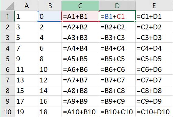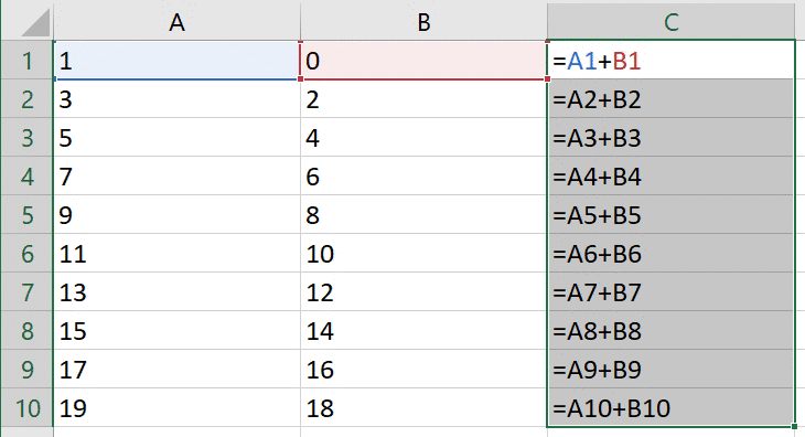 W kolumnie C otrzymasz sumę komórek z dwóch sąsiednich kolumn. Przyjrzyjmy się formułom w komórkach kolumny C. Naciśnij klawisze Ctrl + ` (w lewym górnym rogu klawiatury pod klawiszem ESC). Excel zmieni sposób wyświetlania komórek arkusza i w kolumnie C zobaczysz formuły, a nie ich wyniki:
