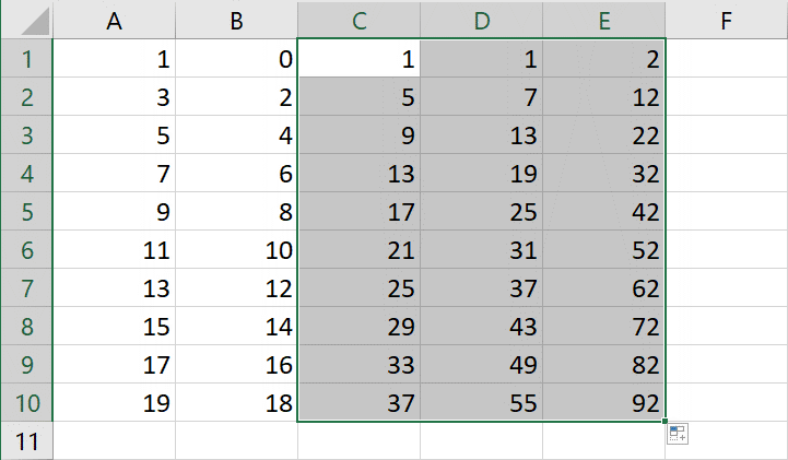 Naciśnij ponownie klawisze Ctrl+', aby wrócić do poprzedniego widoku. Zaznacz komórki od C1 do C10. Następnie przeciągnij uchwyt kopiowania w prawo na kolumny D i E: