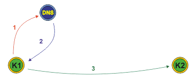 Komputer K1 chce nawiązać połączenie z komputerem K2, którego nazwę domenową zna.