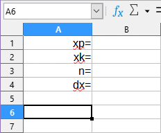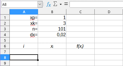 6. Zaznacz na arkuszu komórki z wartościami punktów xi oraz wartościami funkcji: