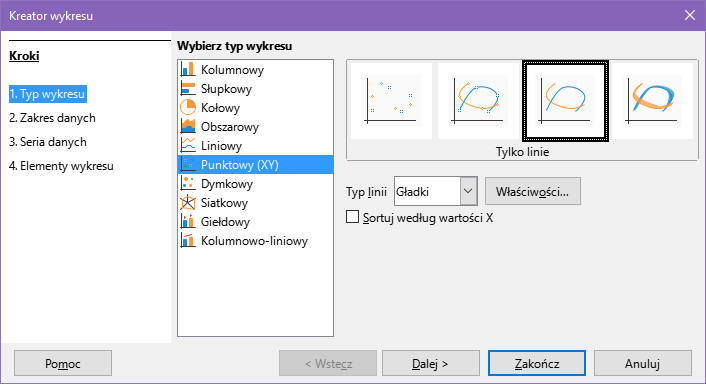 Otrzymane w ten sposób punkty połączymy wygładzonymi liniami za pomocą kreatora wykresów.