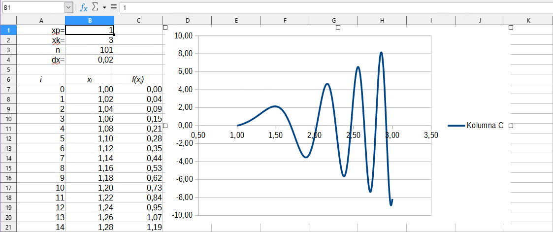 Następnie skopiuj komórkę C7 na komórki C8...C107. Otrzymasz wartości funkcji w punktach xi.