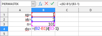 Zatem, aby obliczyć dx, dzielimy długość przedziału przez liczbę odcinków i otrzymujemy powyższy wzór.