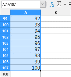 5. Komórki A7...A107 musimy teraz wypełnić kolejnymi liczbami 0,1,2,...,100. Oczywiście nie zrobimy tego ręcznie, lecz skorzystamy z funkcji edycyjnych arkusza. Do komórki A7 wpisz 0, po czym skopiuj je uchwytem kopiowania na komórki do A107. Otrzymasz kolejne numery punktów od 0 do 100: