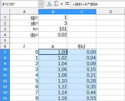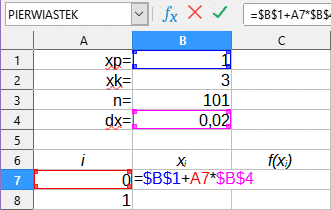Gdy przygotujemy kolumnę z numerami punktów, przejdziemy do przygotowania kolumny z wartościami kolejnych punktów xi. Do komórki B7 wpisujemy formułę (adresy komórek we formule możesz wpisywać ręcznie lub klikać na odpowiednie komórki arkusza. Adres bezwzględny uzyskujesz klikając na odpowiednią komórkę i wciskając klawisz F4):
