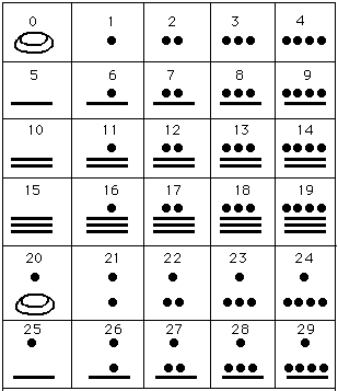 Do zapisu cyfr Majowie używali tylko trzech symboli (podobnie jak Babilończycy). Znak kropki oznaczał jednostkę. Pozioma kreska oznaczała piątkę (tyle mamy palców u ręki). Muszla oznaczała zero. Powyżej można zobaczyć w tabelce, jak wyglądały kolejne liczebniki Majów. Wartość liczby w tym systemie obliczamy mnożąc cyfry przez kolejne potęgi podstawy równej 20, i sumując te iloczyny częściowe.