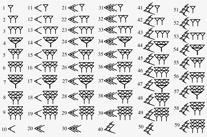 W systemie babilońskim ostatnia cyfra oznaczała liczbę jednostek od 1 do 59. Gdy Babilończyk chciał zapisać liczbę 65, to używał dwóch cyfr (tak samo jak my przy zapisie liczby 15). Pierwsza cyfra 1 oznaczała jedną sześćdziesiątkę. Druga cyfra 5 oznaczała 5 jednostek: