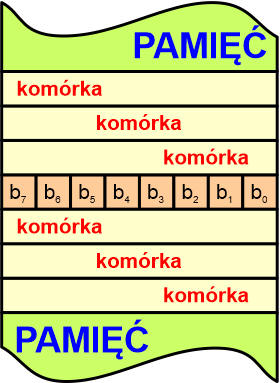 Dane komputer składuje w pamięci (ang. memory), czyli urządzeniu przechowującym bity. Pamięć jest podzielona na komórki (ang. cells), do których ma dostęp procesor komputera. W każdej komórce można przechować 8 bitów informacji: