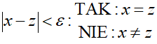 Jak zatem sobie poradzić w takich przypadkach? Zamiast porównywania x z wartością dokładną, sprawdzamy, czy różnica pomiędzy x i wartością dokładną jest dostatecznie bliska zeru. Ponieważ różnica ta może być dodatnia lub ujemna, bierzemy jej wartość bezwzględną. Następnie zakładamy pewne przybliżenie zera (oznaczane najczęściej grecką literką epsilon ε) i sprawdzamy, czy wartość bezwzględna różnicy jest mniejsza od ε. Jeśli tak, to przyjmujemy, iż x jest równe wartości dokładnej z dokładnością do epsilon. Jeśli nie, to x nie jest równe wartości dokładnej: