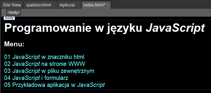 Ustaw hiperłącza do kolejnych plików s1.html...s5.html. Zapisz plik index.html w katalogu witryny.