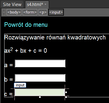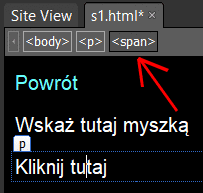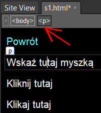 Ustaw kursor na wierszu Wskaż tutaj myszką. U góry okna edytora masz listę znaczników HTML, w których w danym momencie znajduje się kursor: