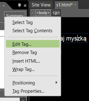 Wskaż myszką znacznik <p>. Wtedy po prawej stronie pojawi się strzałka w dół. Kliknij ją. Otworzy się menu związane ze znacznikiem. Wybierz z niego opcję Edit Tag... (edycja znacznika):
