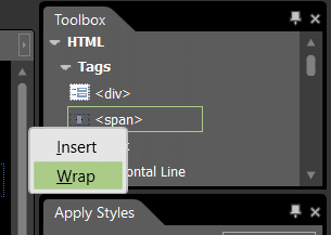 W następnym wierszu będziemy reagowali na kliknięcie w tekst. W tym celu musimy owinąć tekst znacznikiem <span>. Zaznacz wyraz tutaj, po czym w panelu Toolbox kliknij prawym przyciskiem myszki w <span>: