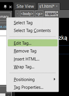 Znacznik <span> powinien być aktywny (ma nieco ciemniejsze tło). Wskaż go myszką, z prawej strony pojawi się strzałka, kliknij w nią i z menu wybierz Edit Tag...: