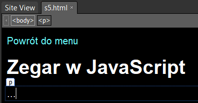 W pierwszym wierszu umieść hiperłącze do strony głównej index.html. Poniżej hiperłącza wstaw nagłówek: Zegar w JavaScript. Poniżej wstaw akapit z trzema kropkami: