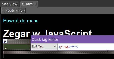 Zapisz skrypt w witrynie i w edytorze wróć do strony s5.html. Przejdź na widok kodu. Przed końcem sekcji <body> ... </body> wpisz następujący znacznik <script>: