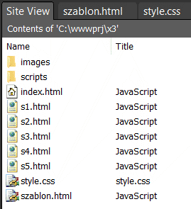 Wróć na zakładkę Site View i skopiuj sześciokrotnie plik szablon.html (przeciągaj plik szablon.html prawym przyciskiem myszki i z menu kontekstowego wybieraj opcję Copy Here) i zmień nazwy kopii na index.html i s1.html...s5.html: