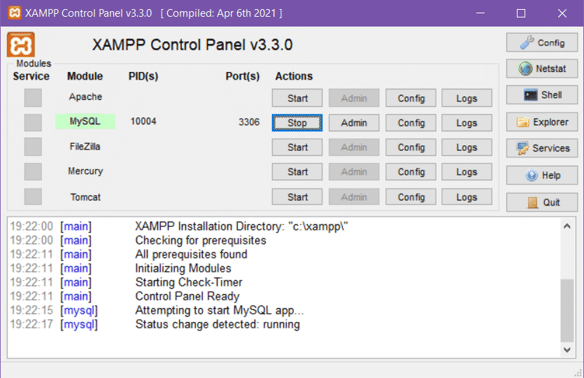 Uruchom panel sterowania XAMPP i włącz serwer MySQL: